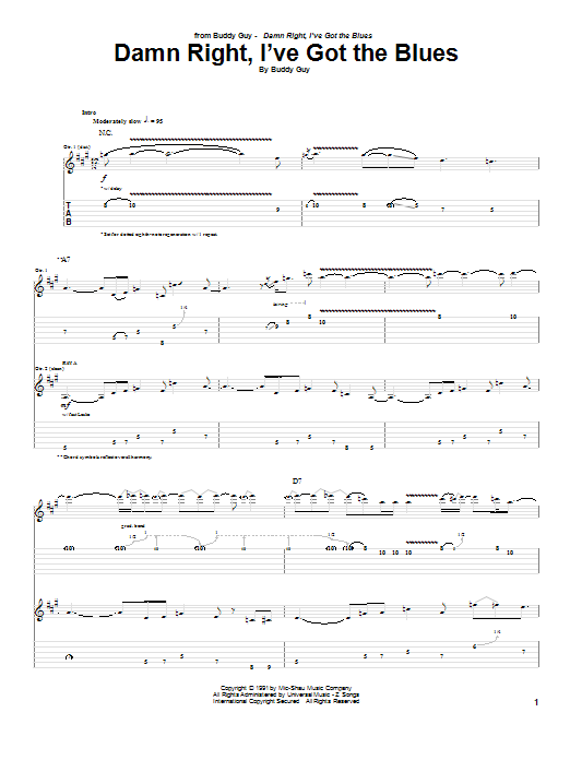 Download or print Buddy Guy Damn Right, I've Got The Blues sheet music, chords and digital score arranged for Guitar Tab (Single Guitar). This Blues score includes 9 page(s).