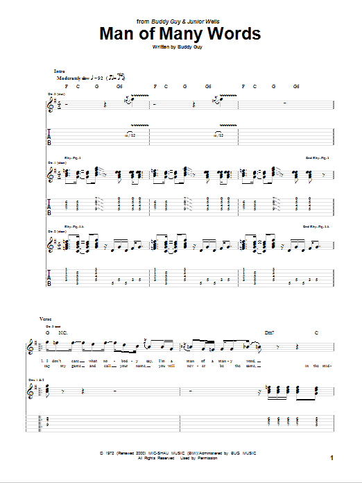 Download or print Buddy Guy Man Of Many Words sheet music, chords and digital score arranged for Guitar Tab. This Blues score includes 11 page(s).
