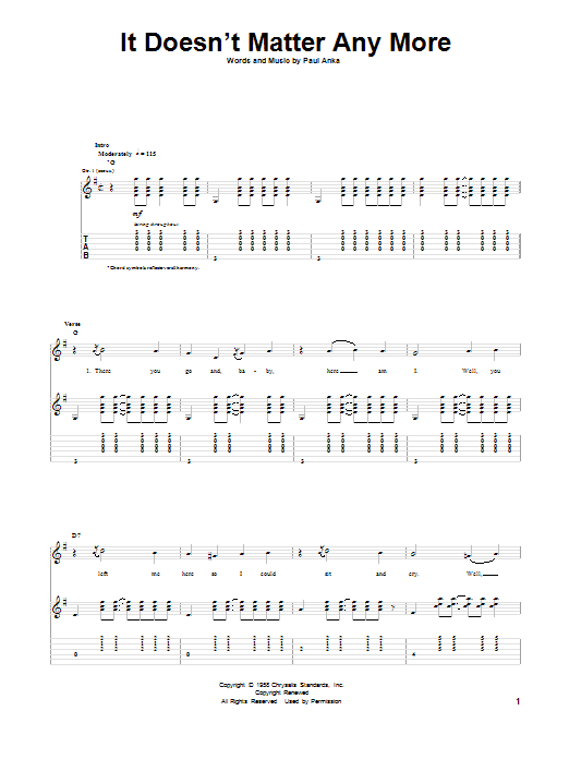 Download or print Buddy Holly It Doesn't Matter Any More sheet music, chords and digital score arranged for Guitar Tab. This Pop score includes 6 page(s).