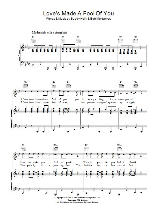 Download or print Buddy Holly Love's Made A Fool Of You sheet music, chords and digital score arranged for Guitar Tab. This Pop score includes 6 page(s).