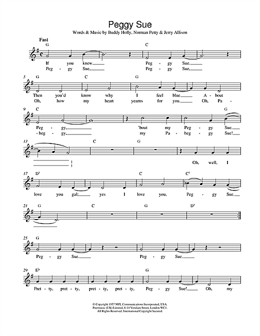Download or print Buddy Holly Peggy Sue sheet music, chords and digital score arranged for Piano Solo. This Oldies score includes 3 page(s).