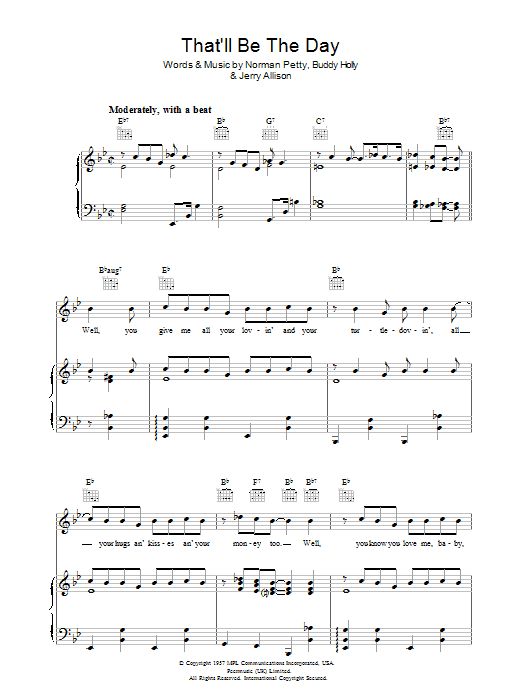 Download or print Buddy Holly That'll Be The Day sheet music, chords and digital score arranged for Piano, Vocal & Guitar Chords (Right-Hand Melody). This Film/TV score includes 3 page(s).