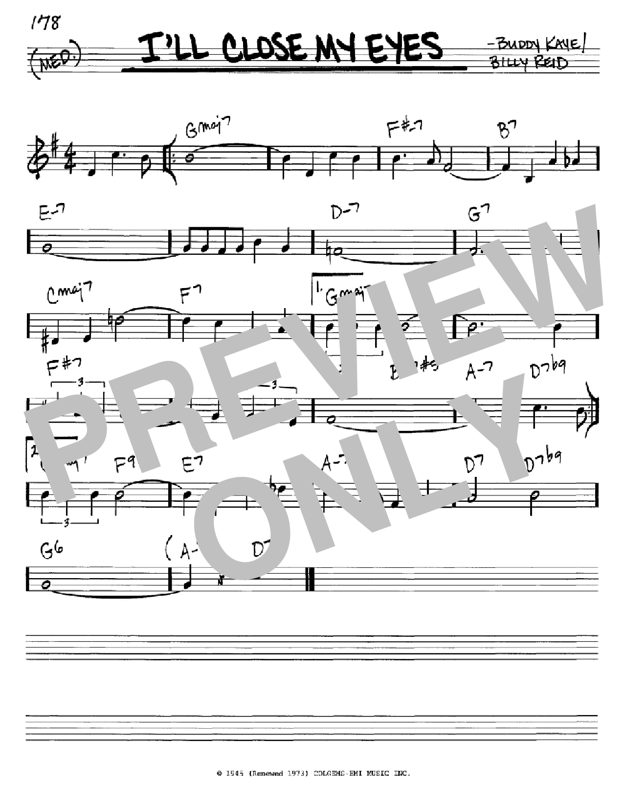 Download or print Buddy Kaye I'll Close My Eyes sheet music, chords and digital score arranged for Lead Sheet / Fake Book. This Blues score includes 1 page(s).