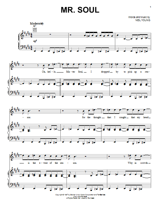 Download or print Buffalo Springfield Mr. Soul sheet music, chords and digital score arranged for Piano, Vocal & Guitar Chords (Right-Hand Melody). This Pop score includes 6 page(s).
