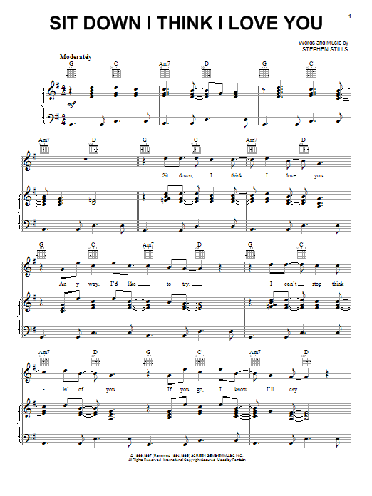 Download or print Buffalo Springfield Sit Down I Think I Love You sheet music, chords and digital score arranged for Piano, Vocal & Guitar Chords (Right-Hand Melody). This Pop score includes 4 page(s).