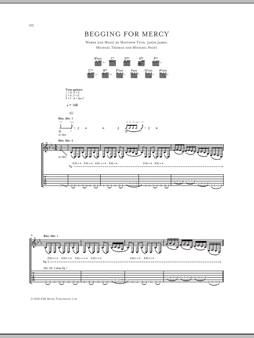 Download or print Bullet For My Valentine Begging For Mercy sheet music, chords and digital score arranged for Guitar Tab. This Metal score includes 9 page(s).