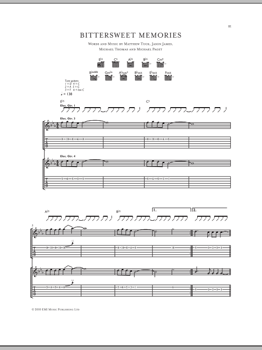 Download or print Bullet For My Valentine Bittersweet Memories sheet music, chords and digital score arranged for Guitar Tab. This Metal score includes 10 page(s).