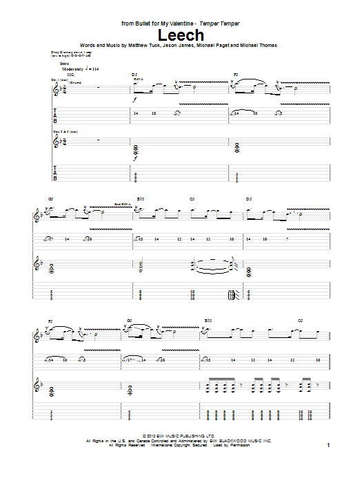Download or print Bullet For My Valentine Leech sheet music, chords and digital score arranged for Guitar Tab. This Pop score includes 7 page(s).