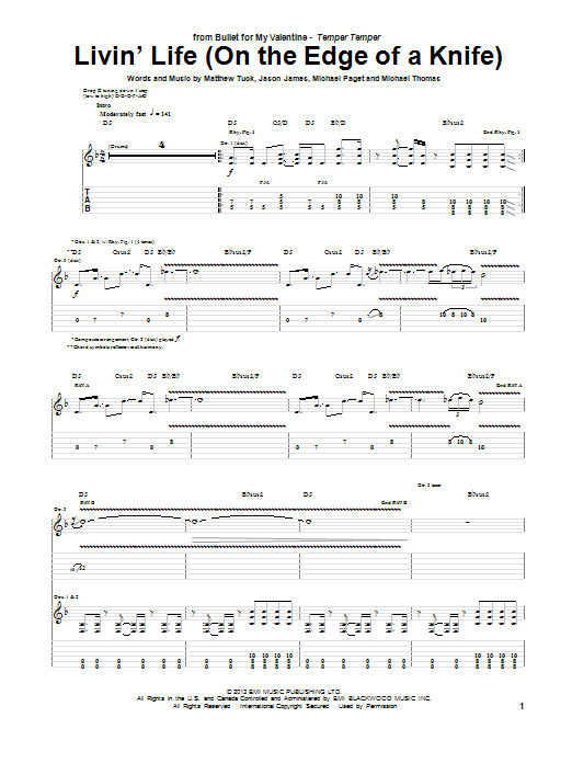 Download or print Bullet For My Valentine Livin' Life (On The Edge Of A Knife) sheet music, chords and digital score arranged for Guitar Tab. This Pop score includes 8 page(s).