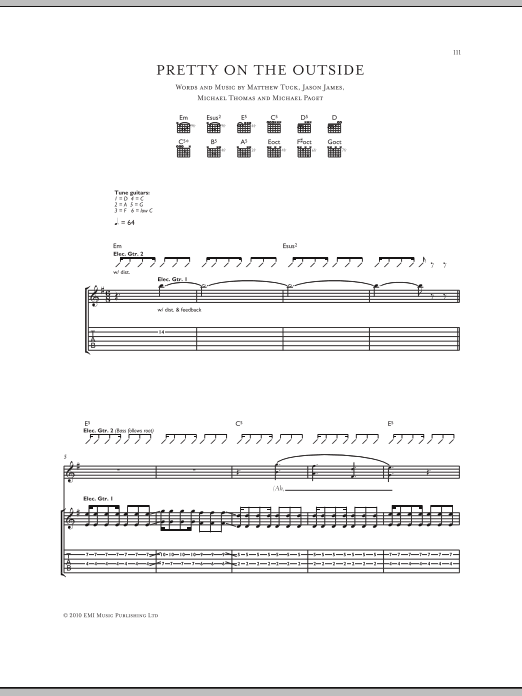 Download or print Bullet For My Valentine Pretty On The Outside sheet music, chords and digital score arranged for Guitar Tab. This Metal score includes 9 page(s).