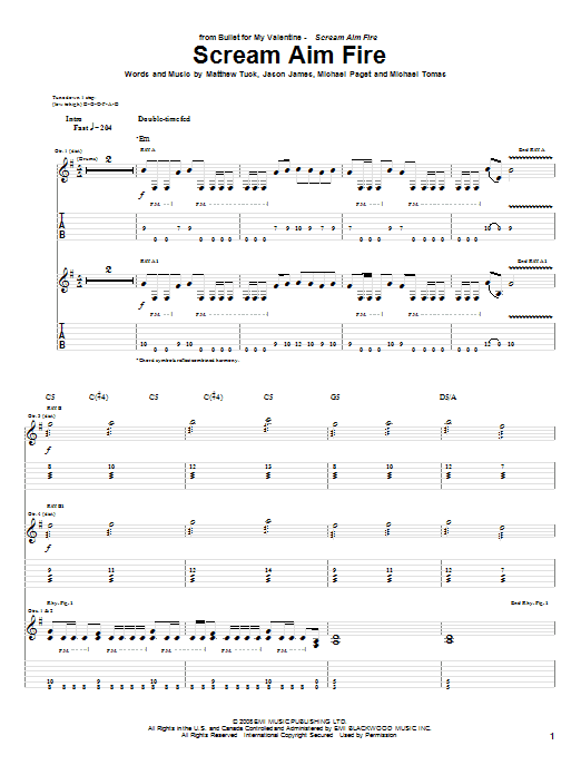 Download or print Bullet For My Valentine Scream Aim Fire sheet music, chords and digital score arranged for Guitar Tab. This Metal score includes 8 page(s).