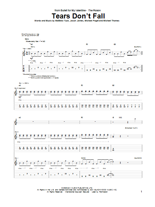Download or print Bullet For My Valentine Tears Don't Fall sheet music, chords and digital score arranged for Guitar Tab. This Metal score includes 13 page(s).