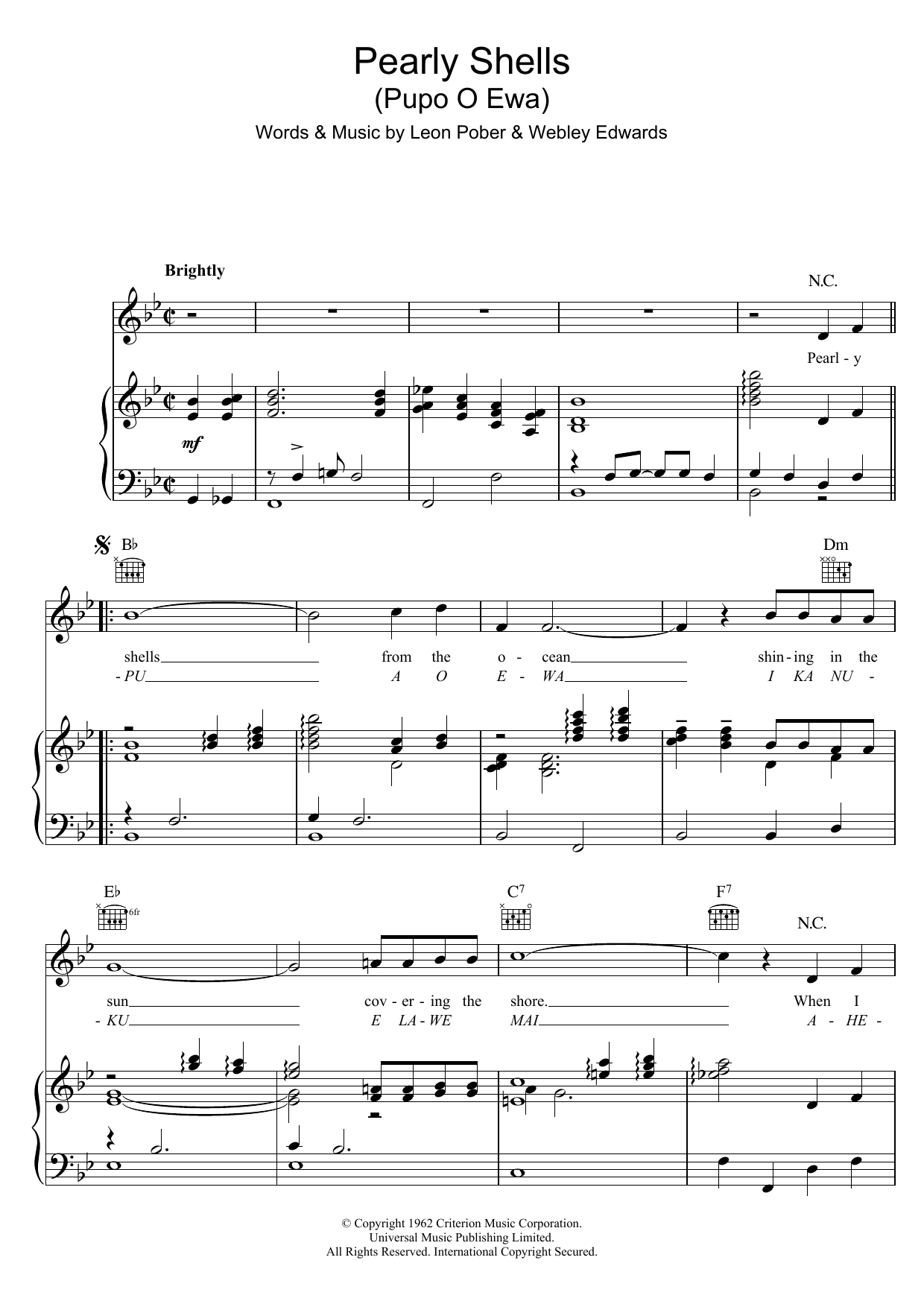 Download or print Don Ho Pearly Shells sheet music, chords and digital score arranged for Piano, Vocal & Guitar Chords. This Standards score includes 3 page(s).