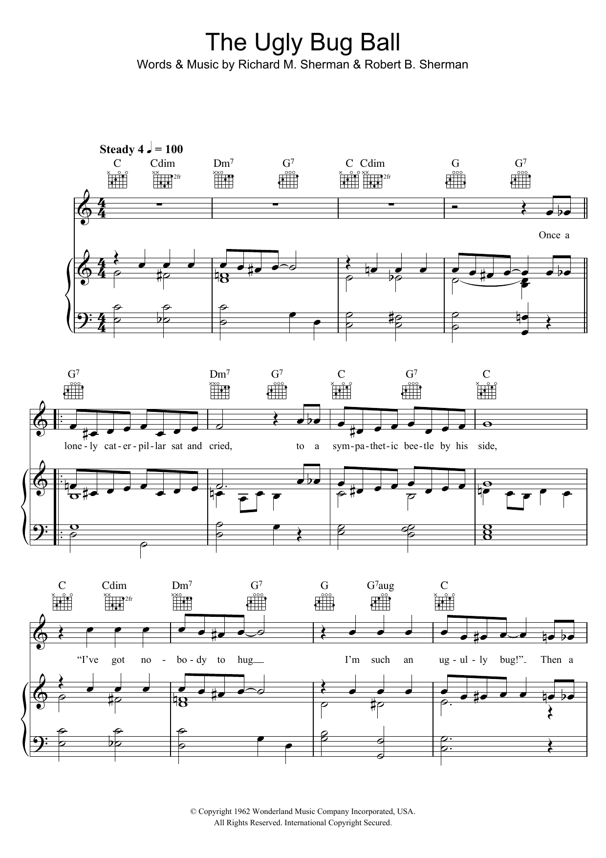 Download or print Burl Ives The Ugly Bug Ball sheet music, chords and digital score arranged for Piano, Vocal & Guitar Chords. This Film/TV score includes 2 page(s).