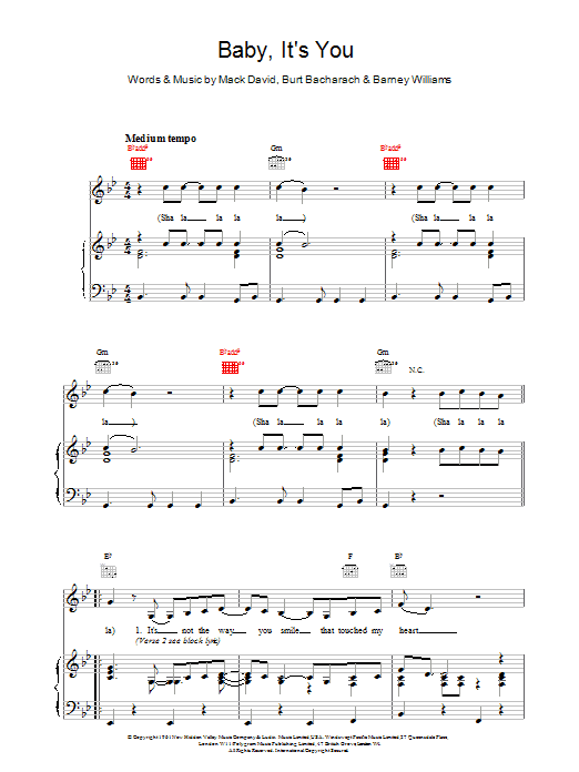 Download or print Bacharach & David Baby, It's You sheet music, chords and digital score arranged for Piano Solo. This Pop score includes 5 page(s).