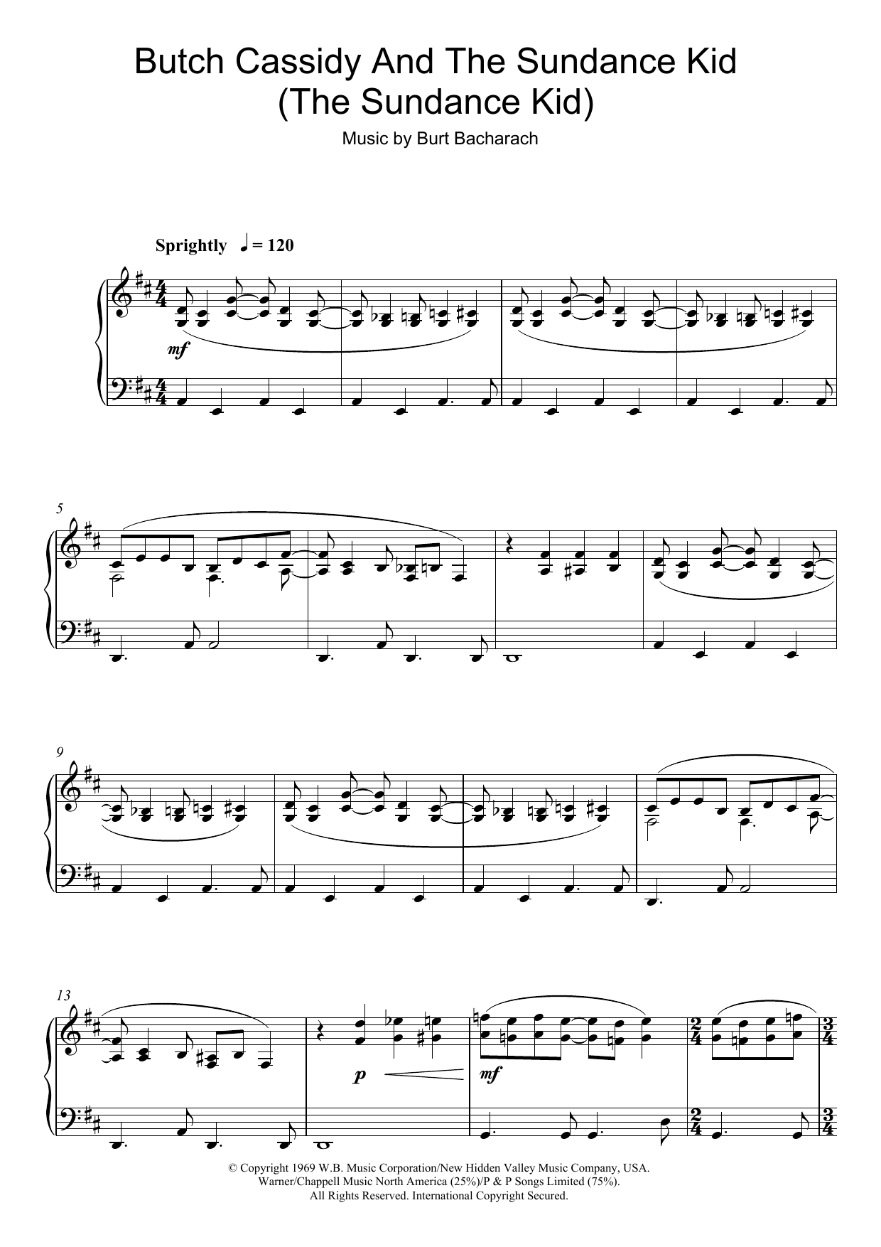 Download or print Burt Bacharach Butch Cassidy And The Sundance Kid (The Sundance Kid) sheet music, chords and digital score arranged for Piano Solo. This Film/TV score includes 3 page(s).