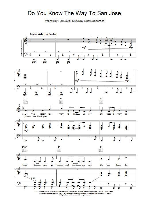 Download or print Burt Bacharach Do You Know The Way To San Jose sheet music, chords and digital score arranged for Piano Solo. This Pop score includes 4 page(s).