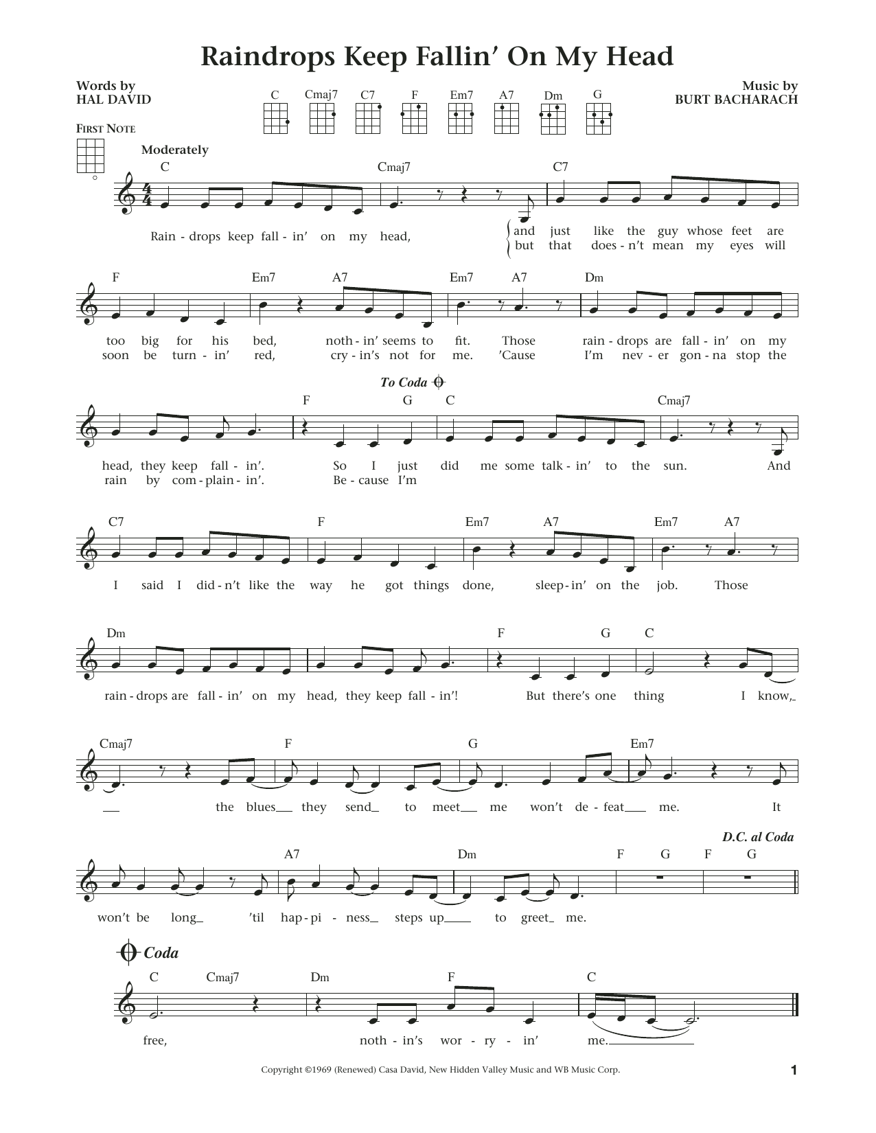 Download or print Burt Bacharach Raindrops Keep Fallin' On My Head (from The Daily Ukulele) (arr. Liz and Jim Beloff) sheet music, chords and digital score arranged for Ukulele. This Oldies score includes 2 page(s).