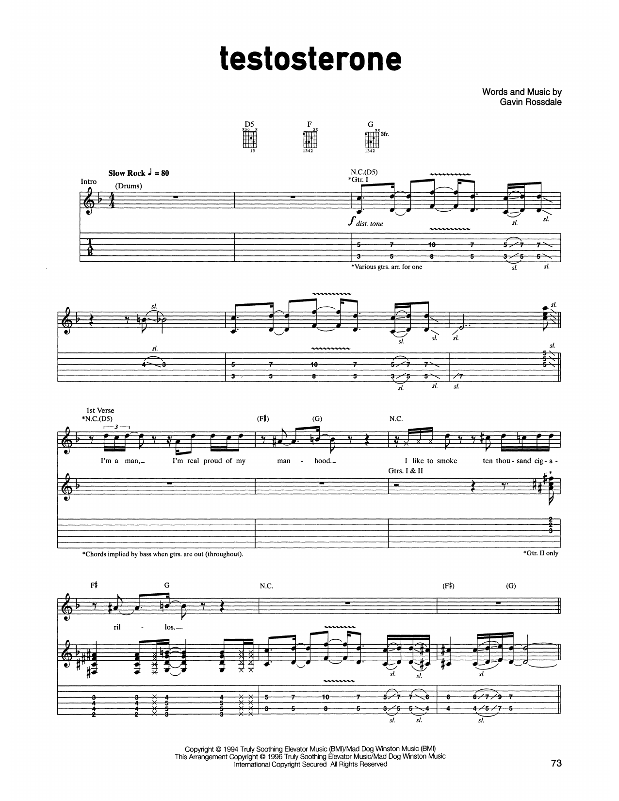Download or print Bush Testosterone sheet music, chords and digital score arranged for Guitar Tab. This Rock score includes 8 page(s).