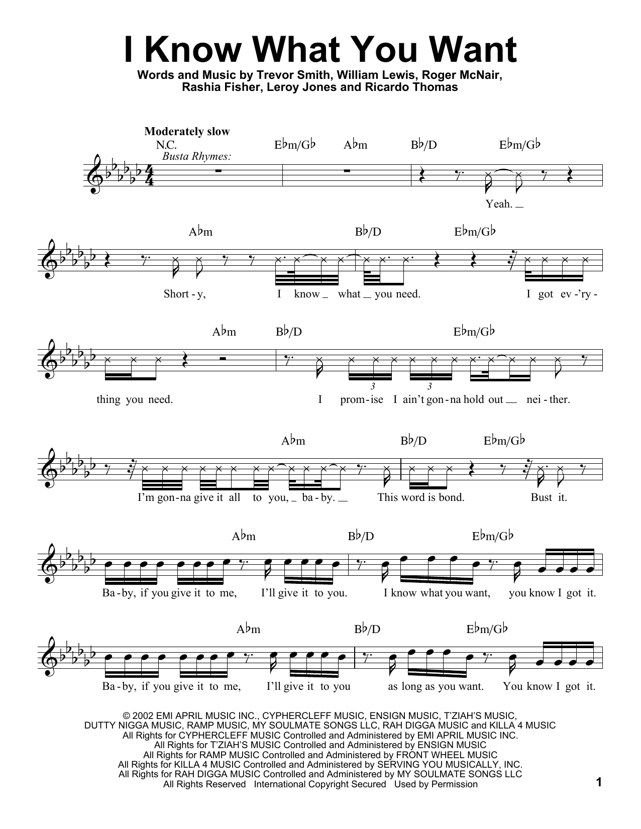 Download or print Busta Rhymes & Mariah Carey Featuring The Flipmode Squad I Know What You Want sheet music, chords and digital score arranged for Pro Vocal. This Hip-Hop score includes 8 page(s).