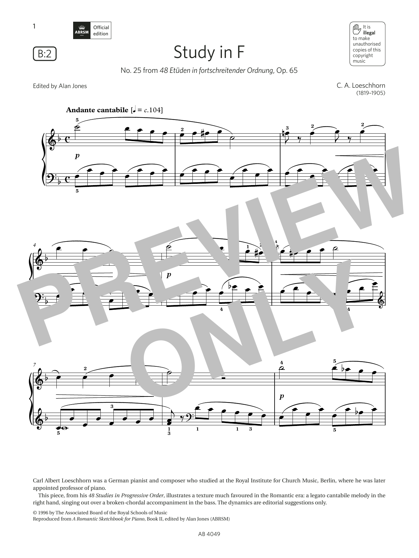 Download or print C A Loeschhorn Study in F (Grade 3, list B2, from the ABRSM Piano Syllabus 2023 & 2024) sheet music, chords and digital score arranged for Piano Solo. This Classical score includes 2 page(s).