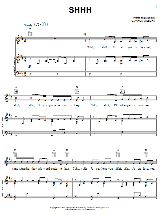 Download or print C. Aaron Wilburn Shhh sheet music, chords and digital score arranged for Piano, Vocal & Guitar Chords (Right-Hand Melody). This Children score includes 2 page(s).