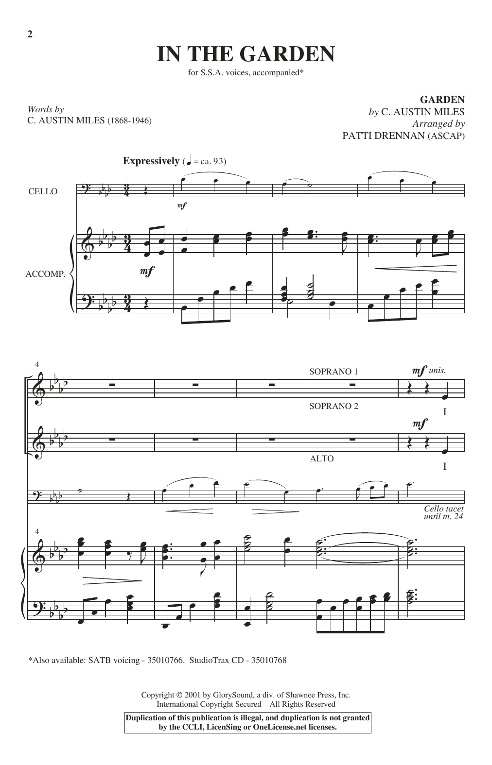 Download or print C. Austin Miles In The Garden (arr. Patti Drennan) sheet music, chords and digital score arranged for SSA Choir. This Lent score includes 15 page(s).
