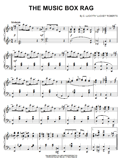 Download or print C. Luckyth "Luckey" Roberts The Music Box Rag sheet music, chords and digital score arranged for Piano Solo. This Jazz score includes 4 page(s).