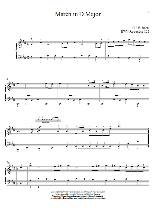 Download or print Johann Sebastian Bach March In D Major sheet music, chords and digital score arranged for Piano Solo. This Classical score includes 2 page(s).