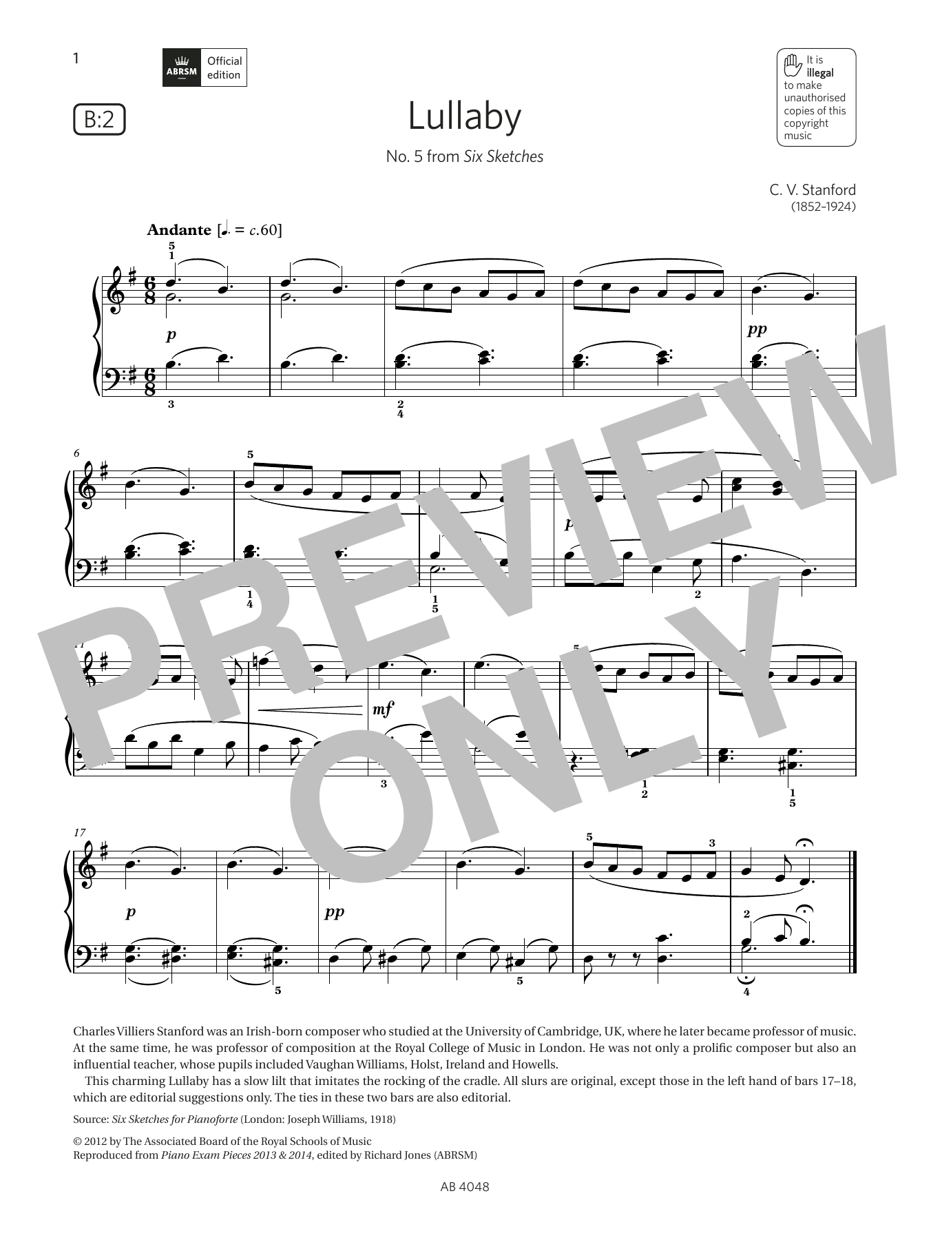 Download or print C V Stanford Lullaby (Grade 2, list B2, from the ABRSM Piano Syllabus 2023 & 2024) sheet music, chords and digital score arranged for Piano Solo. This Classical score includes 1 page(s).