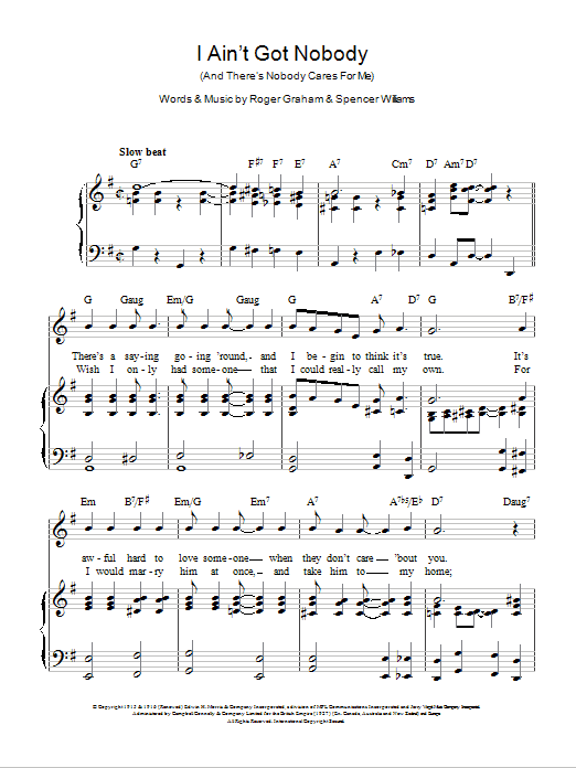 Download or print Cab Calloway I Ain't Got Nobody (And There's Nobody Cares For Me) sheet music, chords and digital score arranged for Piano, Vocal & Guitar Chords. This Jazz score includes 5 page(s).