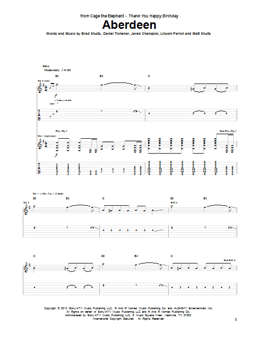 Download or print Cage The Elephant Aberdeen sheet music, chords and digital score arranged for Guitar Tab. This Pop score includes 9 page(s).