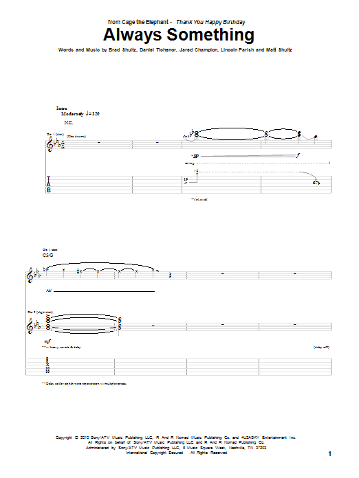 Download or print Cage The Elephant Always Something sheet music, chords and digital score arranged for Guitar Tab. This Pop score includes 8 page(s).