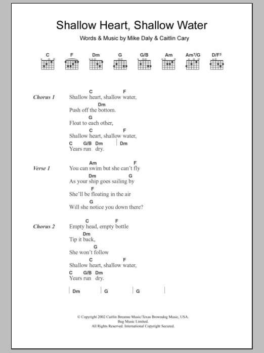 Download or print Caitlin Cary Shallow Heart, Shallow Water sheet music, chords and digital score arranged for Guitar Chords/Lyrics. This Country score includes 3 page(s).
