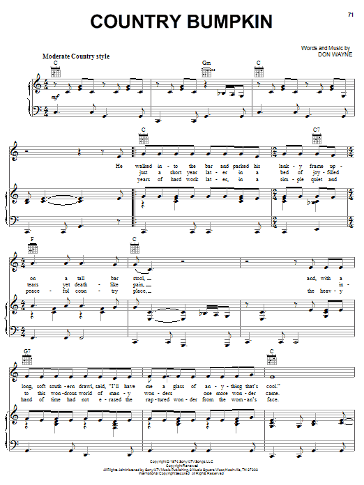 Download or print Cal Smith Country Bumpkin sheet music, chords and digital score arranged for Piano, Vocal & Guitar Chords (Right-Hand Melody). This Country score includes 3 page(s).