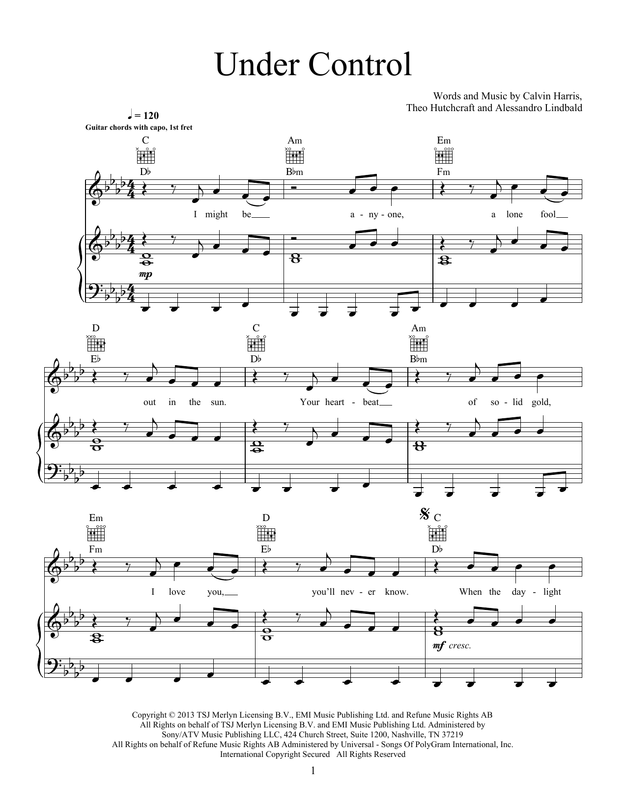 Download or print Calvin Harris and Alesso Under Control (feat. Hurts) sheet music, chords and digital score arranged for Piano, Vocal & Guitar Chords (Right-Hand Melody). This Pop score includes 6 page(s).