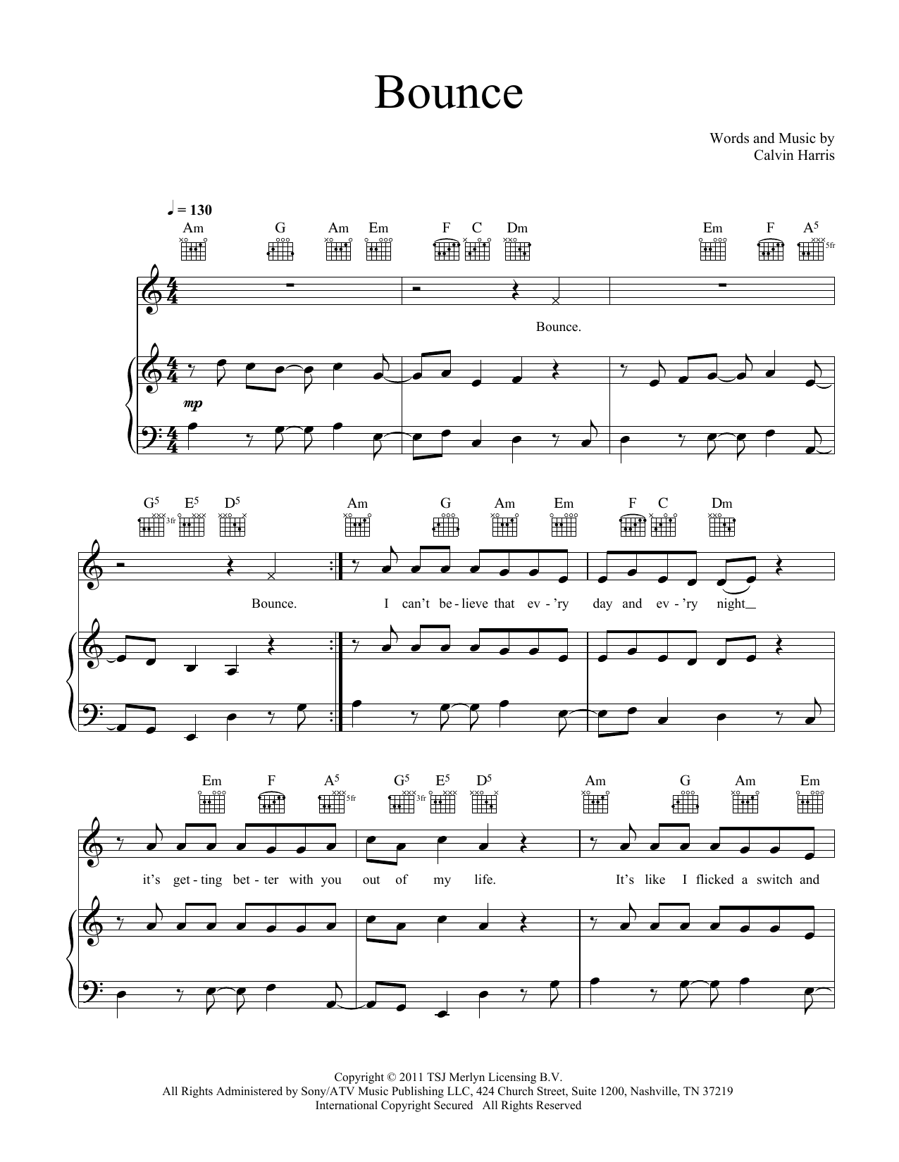 Download or print Calvin Harris Bounce (feat. Kelis) sheet music, chords and digital score arranged for Piano, Vocal & Guitar Chords (Right-Hand Melody). This Pop score includes 7 page(s).