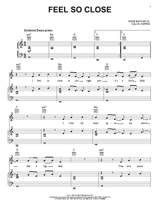 Download or print Calvin Harris Feel So Close sheet music, chords and digital score arranged for Piano, Vocal & Guitar Chords (Right-Hand Melody). This Pop score includes 5 page(s).