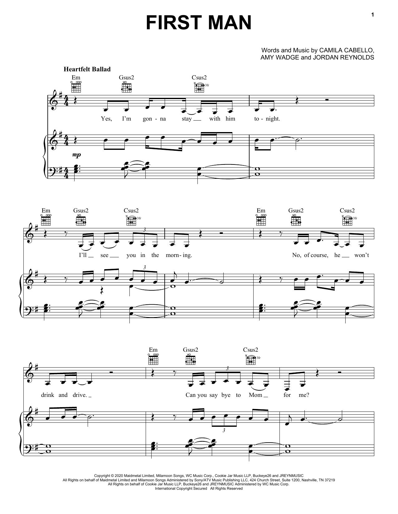 Download or print Camila Cabello First Man sheet music, chords and digital score arranged for Piano, Vocal & Guitar Chords (Right-Hand Melody). This Pop score includes 7 page(s).