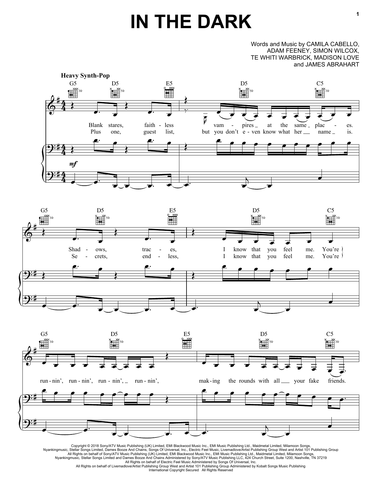 Download or print Camila Cabello In The Dark sheet music, chords and digital score arranged for Piano, Vocal & Guitar Chords (Right-Hand Melody). This Latin score includes 5 page(s).