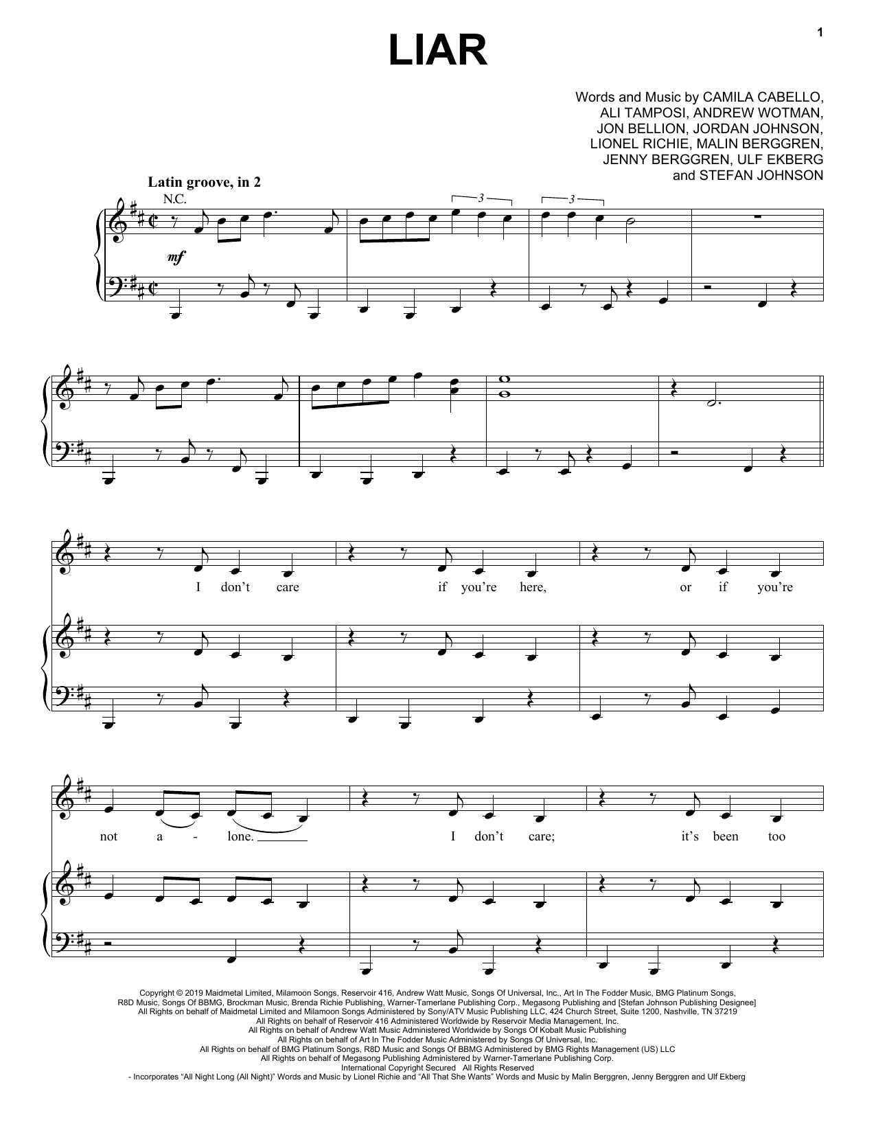 Download or print Camila Cabello Liar sheet music, chords and digital score arranged for Piano, Vocal & Guitar Chords (Right-Hand Melody). This Pop score includes 9 page(s).