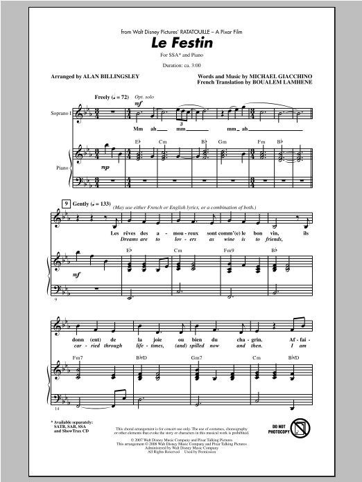 Download or print Alan Billingsley Le Festin (from Ratatouille) sheet music, chords and digital score arranged for SAB Choir. This Disney score includes 11 page(s).