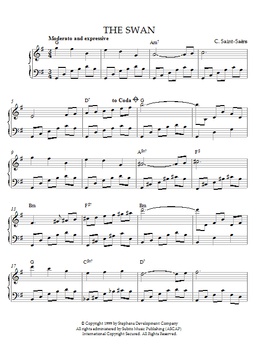 Download or print Camille Saint-Saens The Swan sheet music, chords and digital score arranged for Easy Piano. This Classical score includes 3 page(s).