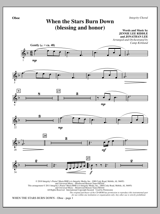Download or print Camp Kirkland When The Stars Burn Down (Blessing And Honor) - Oboe sheet music, chords and digital score arranged for Choir Instrumental Pak. This Contemporary score includes 2 page(s).