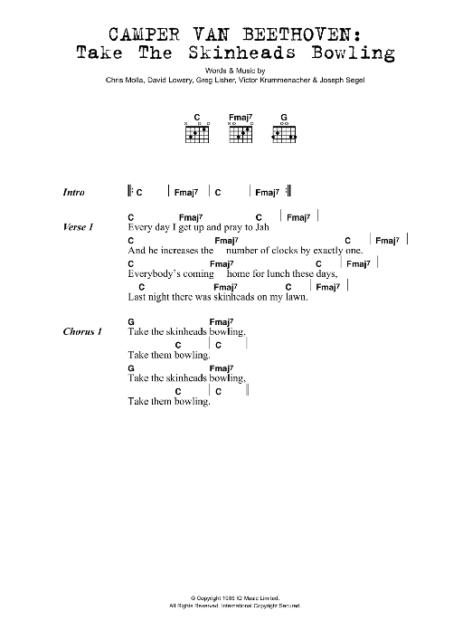 Download or print Camper Van Beethoven Take The Skinheads Bowling sheet music, chords and digital score arranged for Guitar Chords/Lyrics. This Rock score includes 2 page(s).