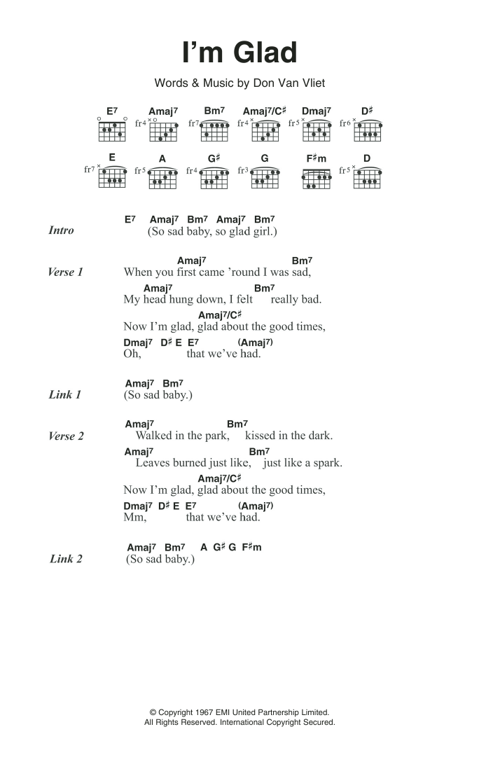 Download or print Captain Beefheart I'm Glad sheet music, chords and digital score arranged for Guitar Chords/Lyrics. This Rock score includes 2 page(s).