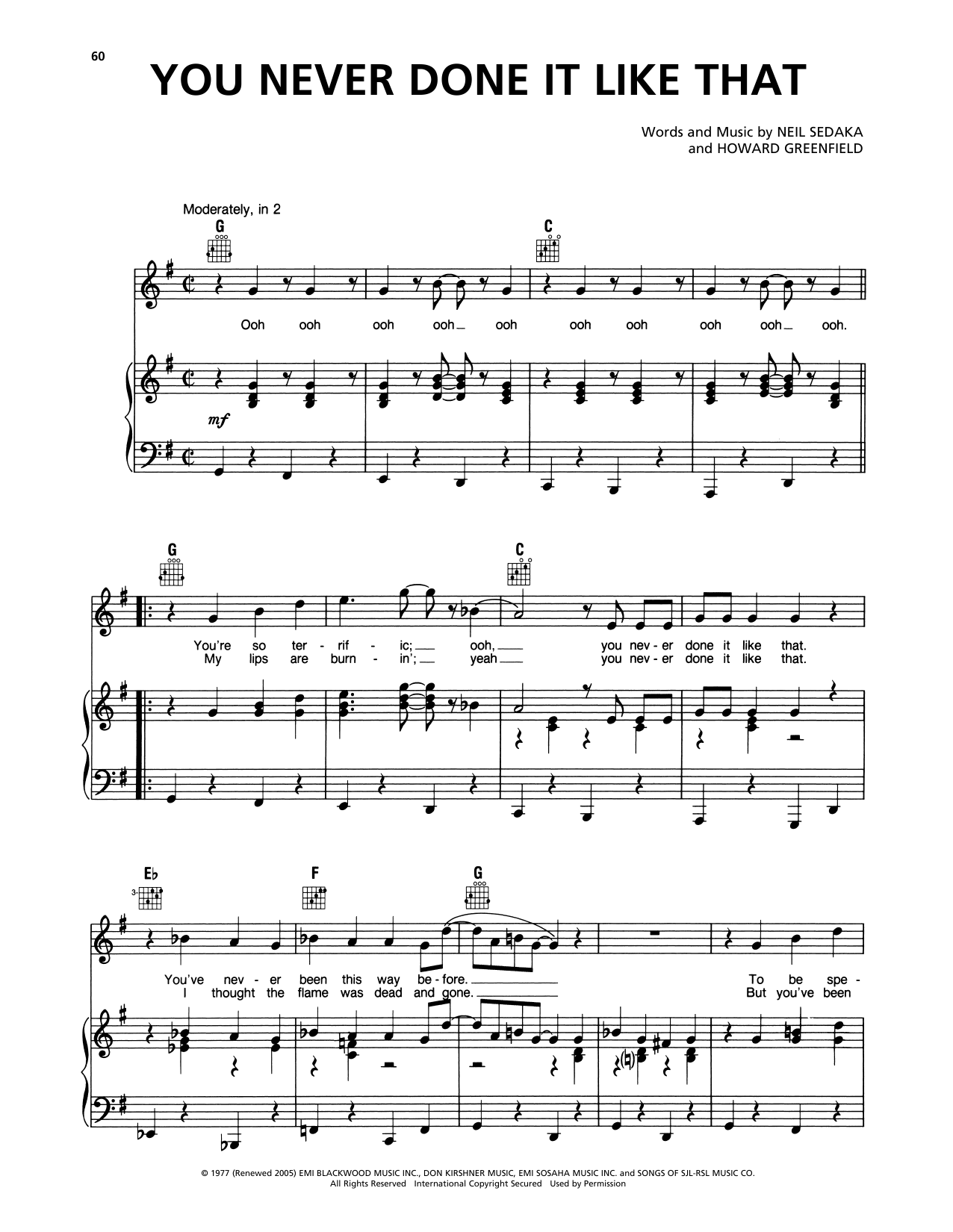 Download or print Captain & Tennille You Never Done It Like That sheet music, chords and digital score arranged for Piano, Vocal & Guitar Chords (Right-Hand Melody). This Pop score includes 5 page(s).