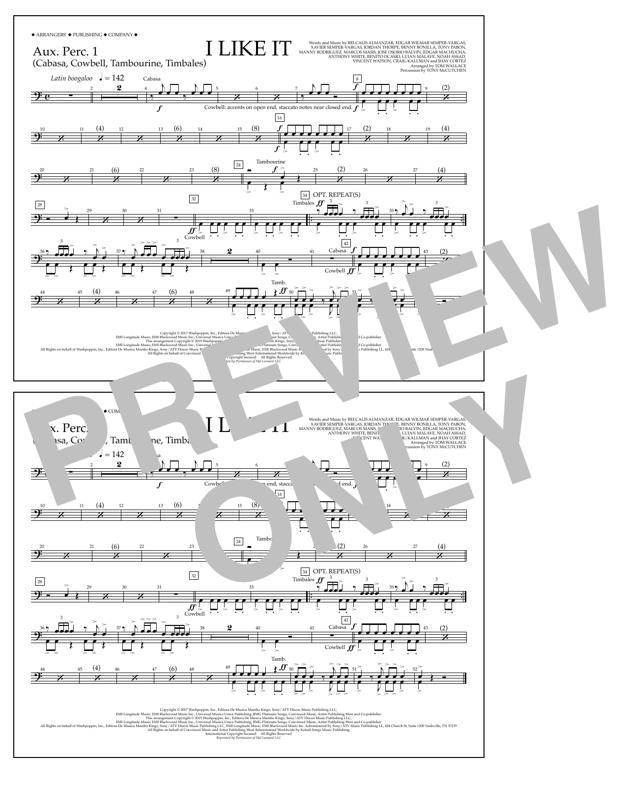 Download or print Cardi B, Bad Bunny & J Balvin I Like It (arr. Tom Wallace) - Aux. Perc. 1 sheet music, chords and digital score arranged for Marching Band. This Latin score includes 1 page(s).