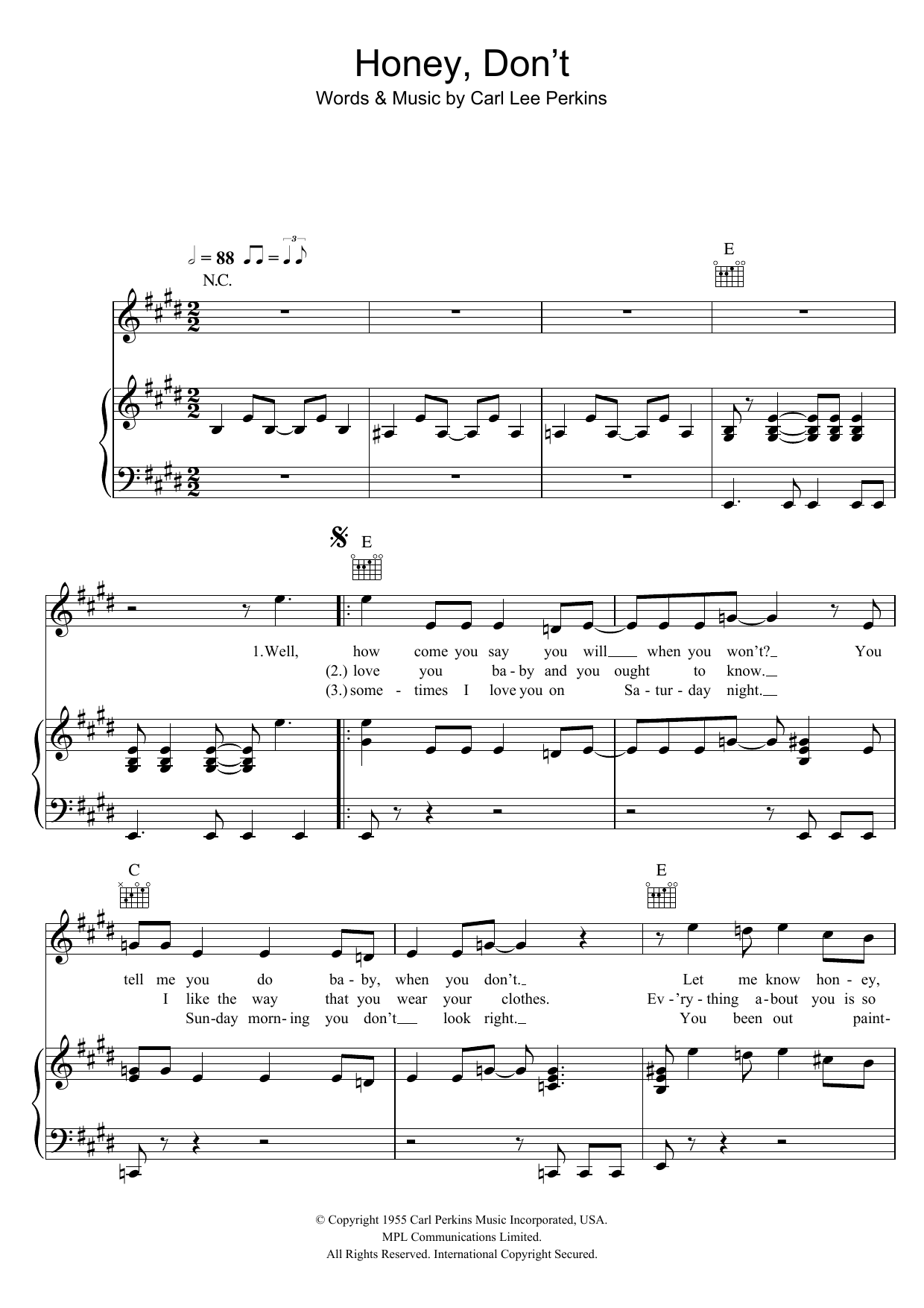 Download or print Carl Lee Perkins Honey, Don't sheet music, chords and digital score arranged for Piano, Vocal & Guitar Chords. This Standards score includes 5 page(s).