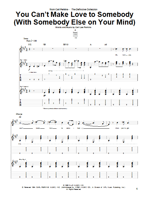 Download or print Carl Perkins You Can't Make Love To Somebody (With Somebody Else On Your Mind) sheet music, chords and digital score arranged for Guitar Tab. This Pop score includes 9 page(s).